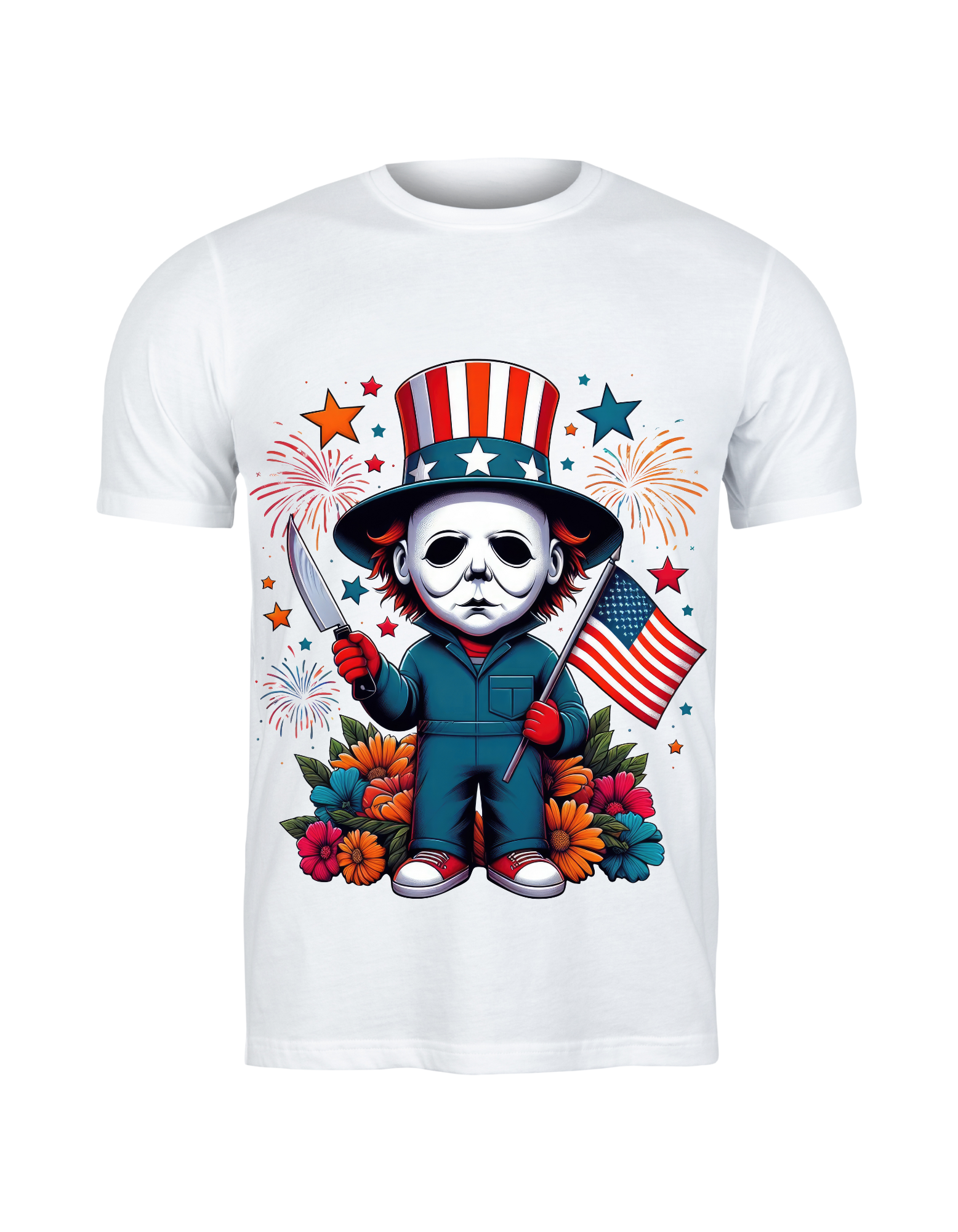 Celebrate Independence Day with a chillingly cute twist! This T-shirt features an adorable Michael Myers decked out in red, white, and blue, ready to join your Fourth of July festivities. Whether he’s sporting a tiny patriotic mask or holding a little American flag, this playful design blends classic horror vibes with holiday spirit. Perfect for fans who want to add a touch of spooky charm to their summer BBQs, fireworks, and all-American fun. Soft, comfy, and full of personality—this tee is a must-have for anyone who loves a little fright with their fireworks!